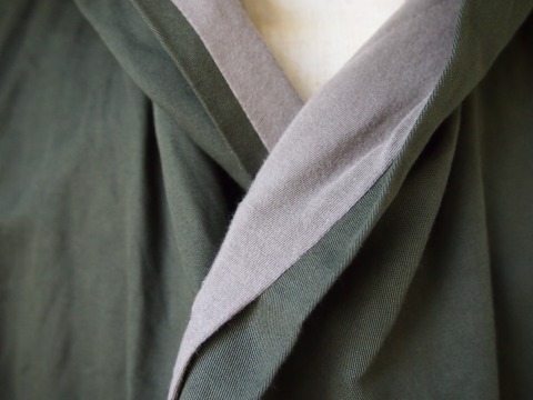 ベースのカーキ部分はあえてシワ感が出やすいようコットンにリネンを混ぜた素材を使用しており、内側の肌に触れる部分は滑らかなコットンジャージ素材を使っております。