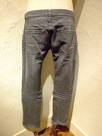 ブラックデニムを色落ちさせてクラッシュ加工を加えたデニムパンツです。